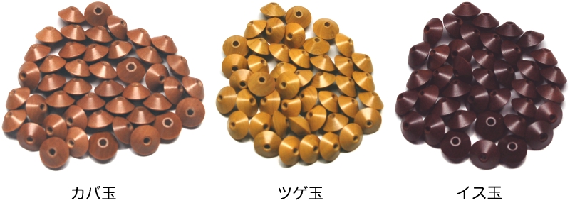 カバ玉は濃い茶色の珠で、長く使っていても汚れが目立ちにくいのがポイント。少々荒っぽく使っても傷がつきにくく丈夫です。ツゲ玉に比べても手入れが楽なのも、良い点の一つ。