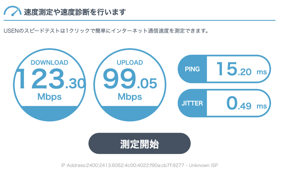 計測する方法はいくつかありますが、USENのスピードテストがわかりやすくておすすめです。